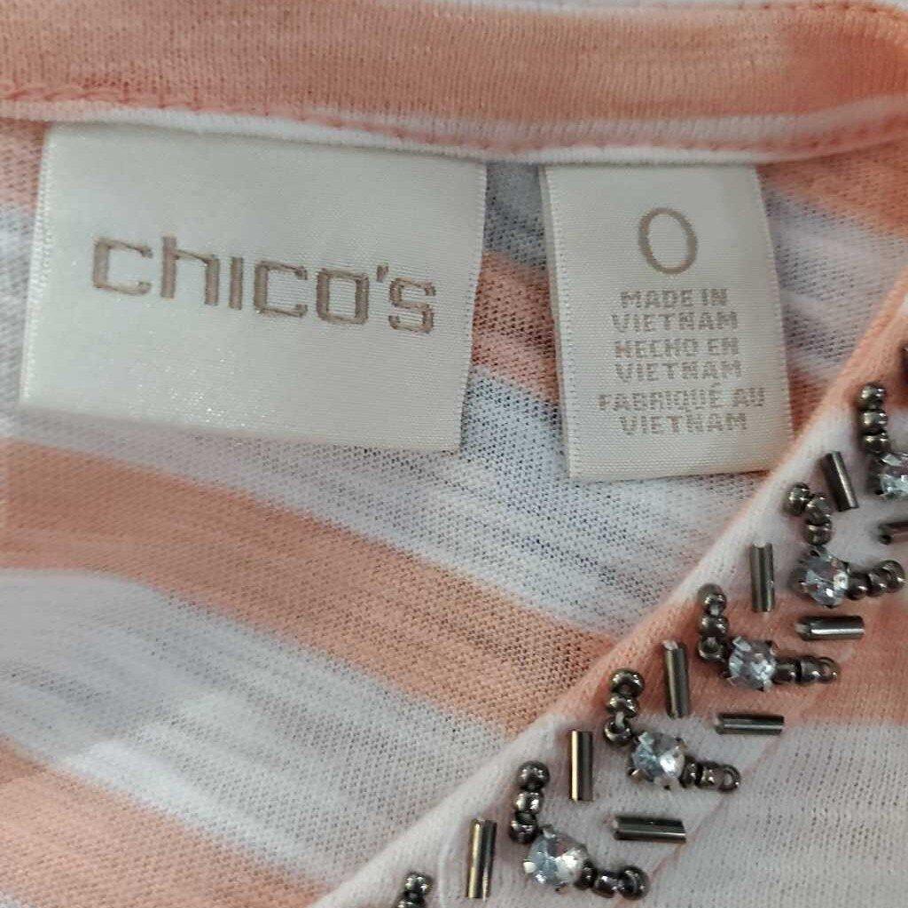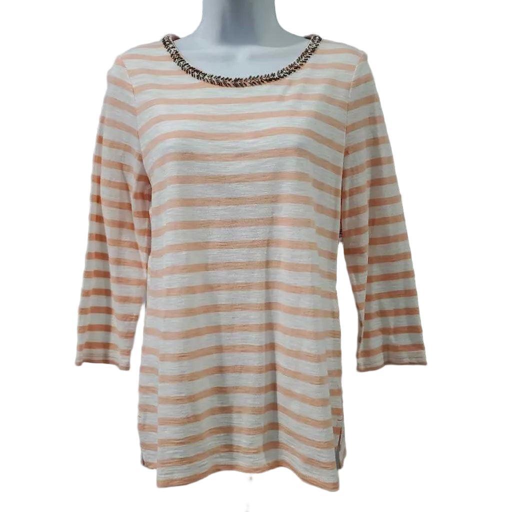 3/4 Sleeve Striped Embellished Neck Knit Top, Chico's Size 0 â