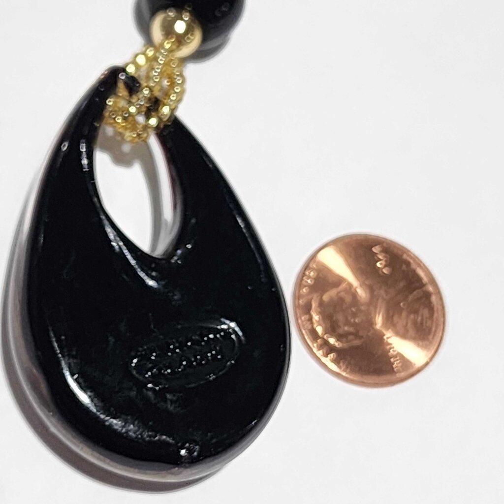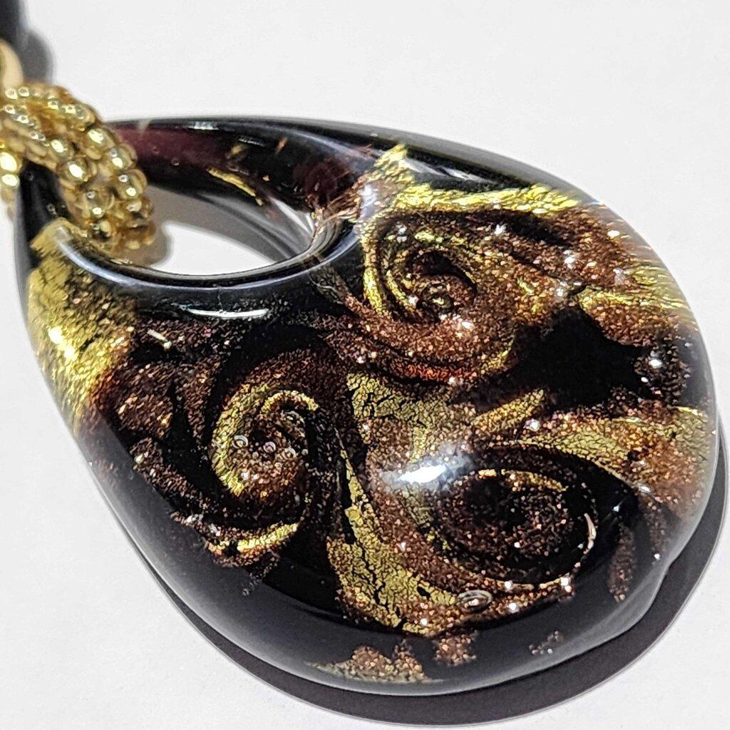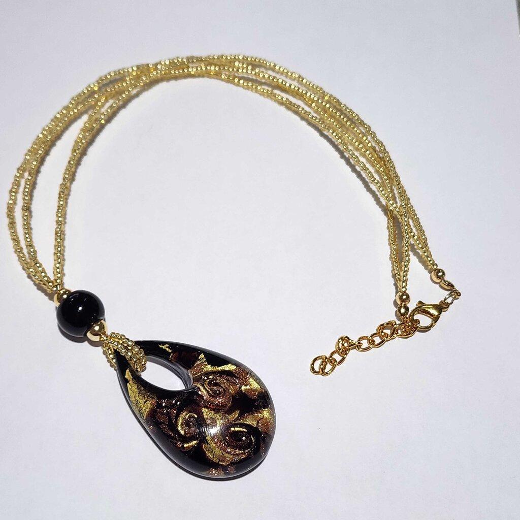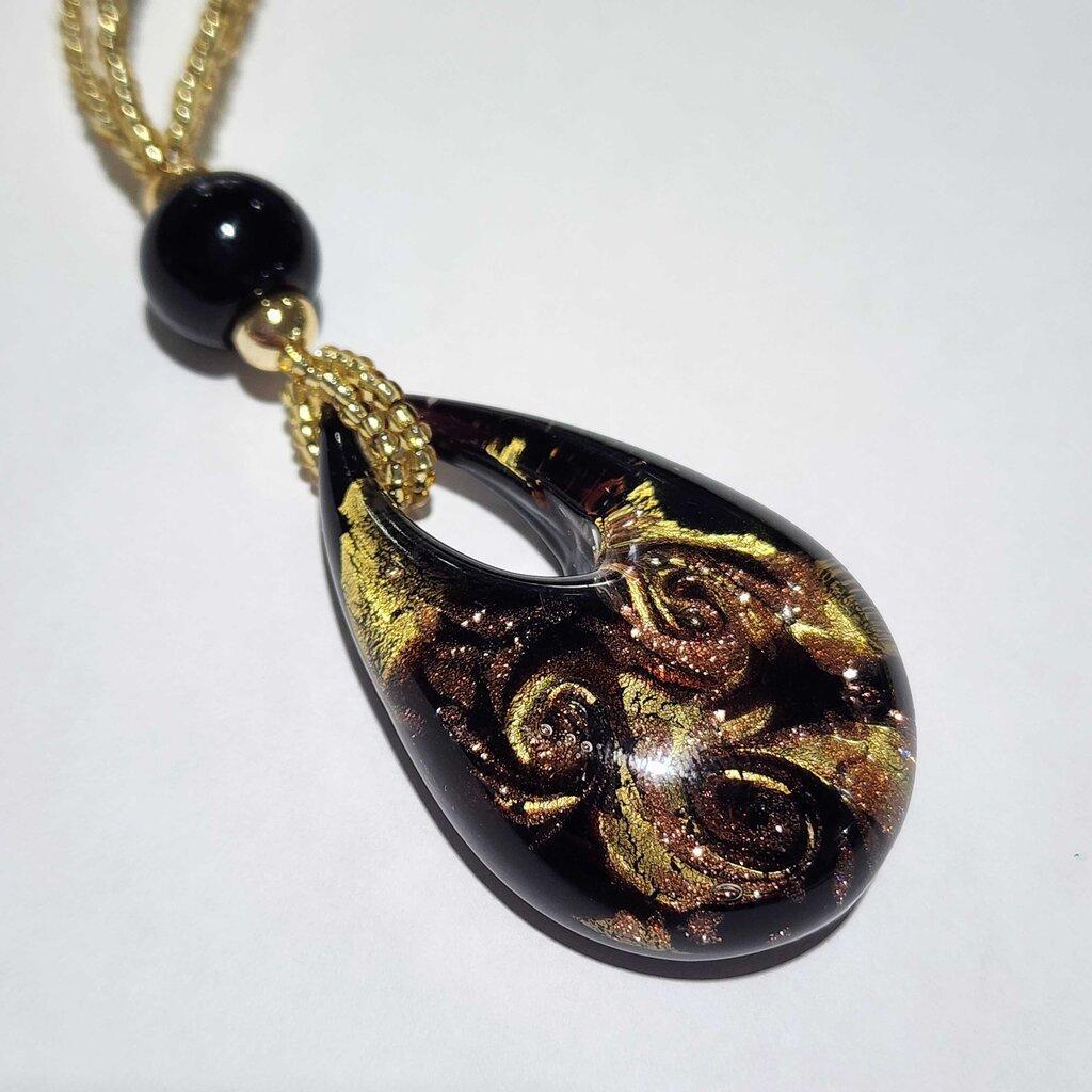 This striking necklace features a genuine signed Murano Glass teardrop pendant in black with shimmering gold and copper foil swirls encased in clear glass. The pendant is suspended from a lightweight gold-tone multi-strand seed bead chain with extender. While the chain is not original to the pendant and appears fashion-grade, the pendant itself is authentic Murano artistry—perfect for collectors or anyone seeking a bold, elegant piece with Venetian charm. ✅ Triple inspected for quality, condition & authenticity! 💯 Authenticity guaranteed or money back. ❓ Questions? Contact us. 📍 Ships from Enterprise, AL.