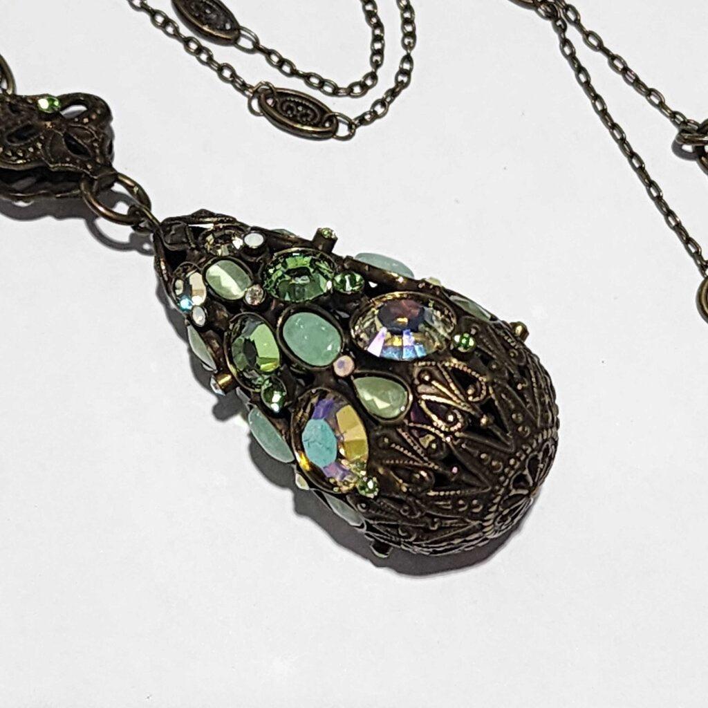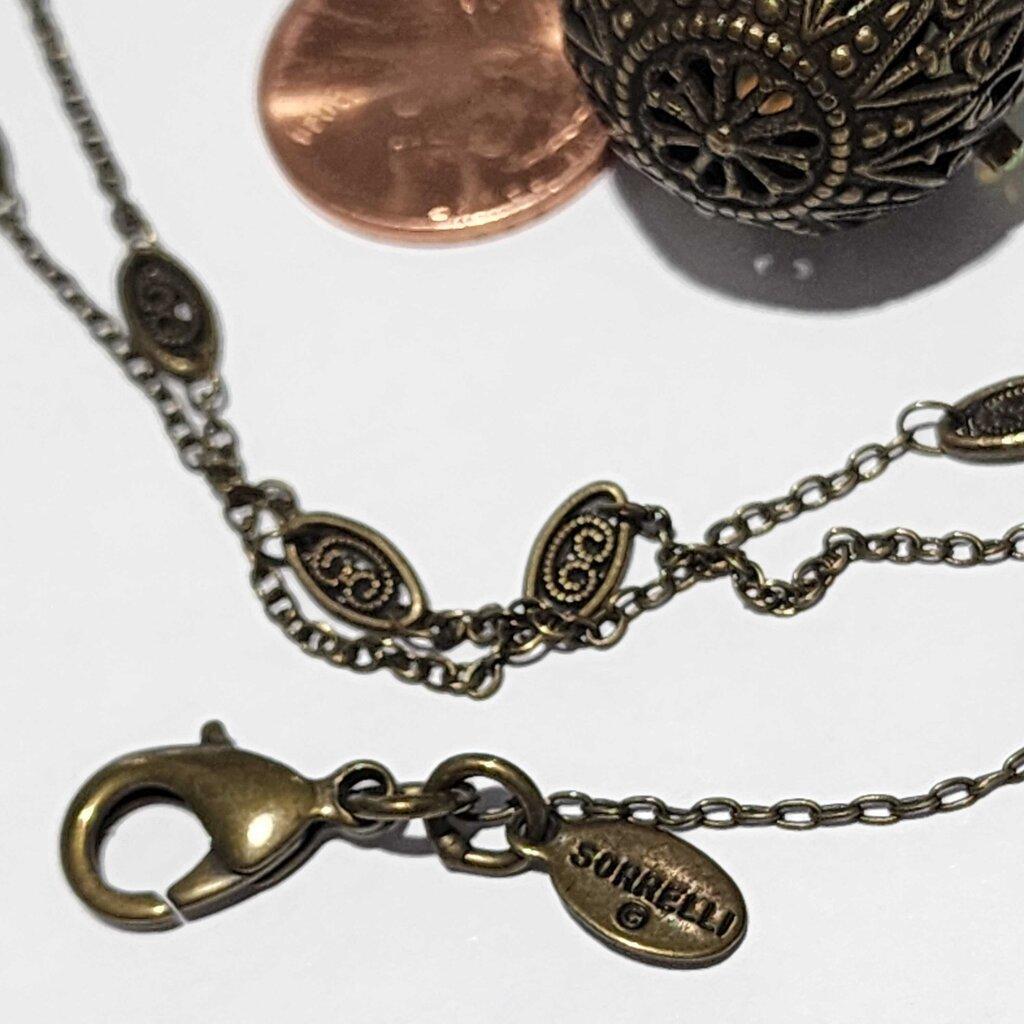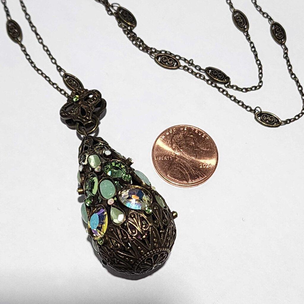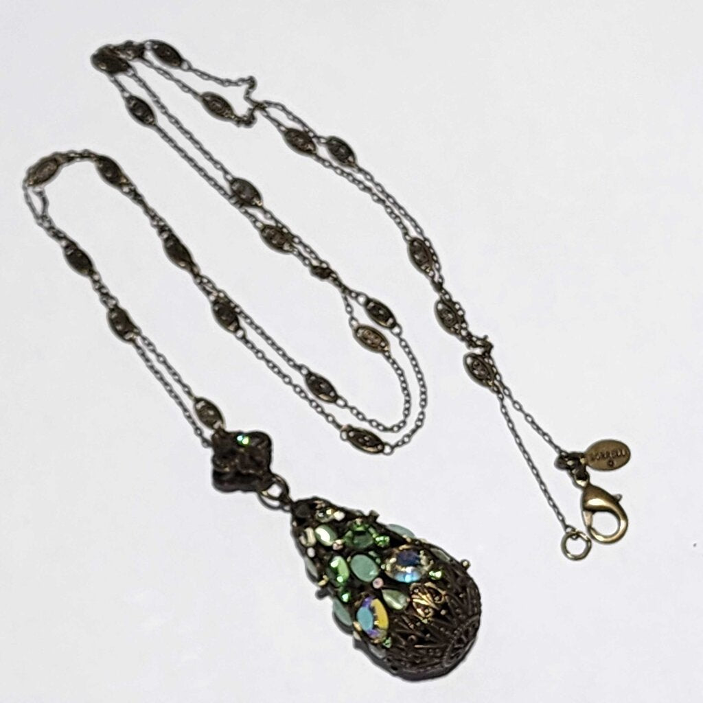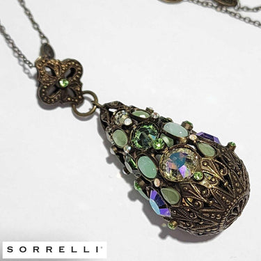 his stunning Sorrelli necklace features a large teardrop pendant set with sparkling green, opalescent, and iridescent crystals, framed by antique brass filigree. The pendant hangs from a coordinating antique brass chain with oval crystal stations and a secure lobster clasp closure. A beautiful example of Sorrelli’s signature vintage-inspired design—perfect for adding shimmer and sophistication to both everyday and dressy looks. ✅ Triple inspected for quality, condition & authenticity! 💯 Authenticity guaranteed or money back. ❓ Questions? Contact us. 📍 Ships from Enterprise, AL.