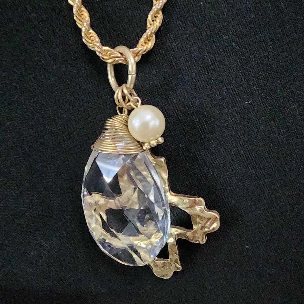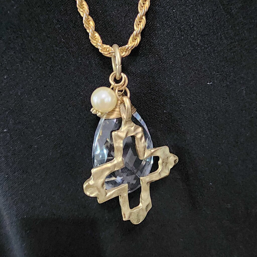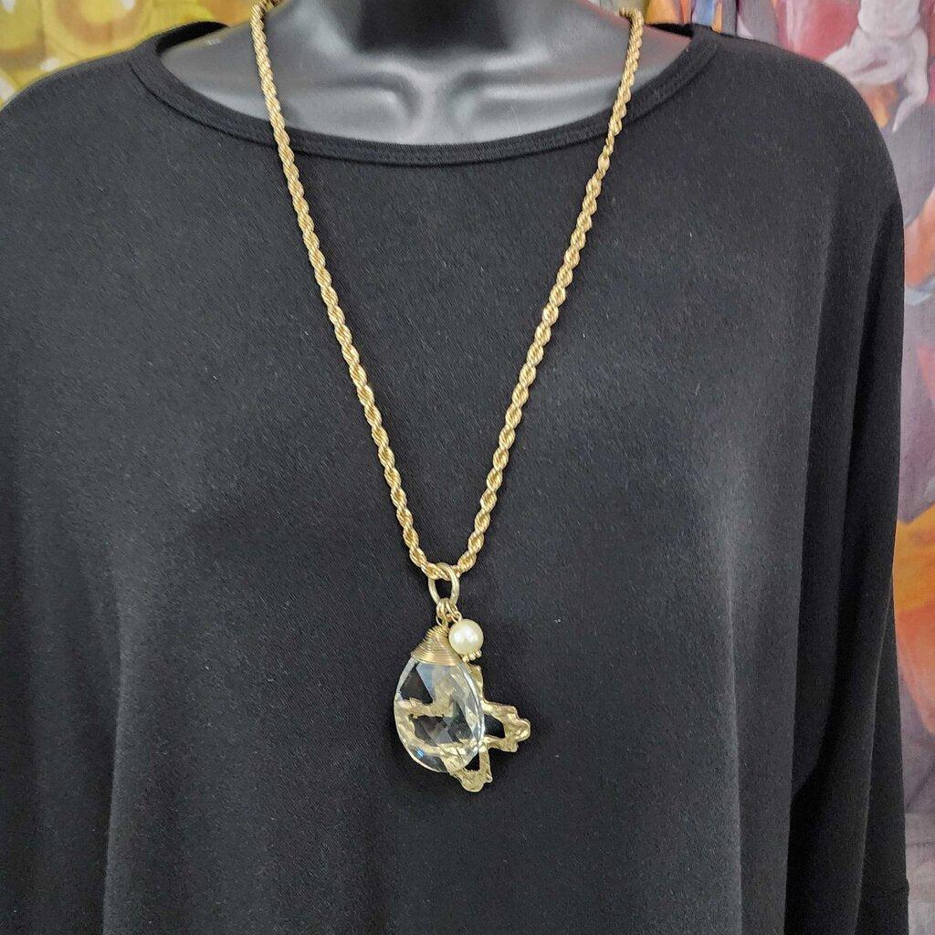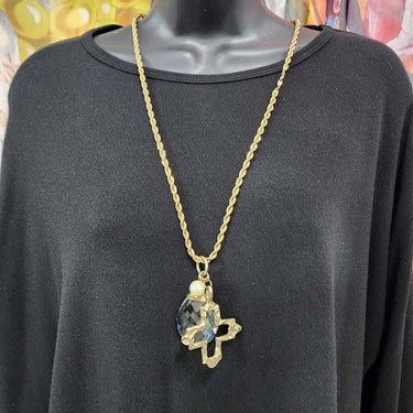 This beautiful vintage necklace by Trifari features a 30-inch textured gold-tone rope chain and a striking pendant trio: a hammered abstract cross, a faceted teardrop crystal, and a classic faux pearl accent. Signed with the iconic Crown Trifari logo, this piece blends bold style with timeless charm. A versatile statement necklace ideal for layering or standalone wear. 🖤 Pre-owned in excellent condition. ✨ From our triple-inspected collection at Consignment Cat. 💜 Explore more unique vintage finds in our full Trifari & designer jewelry collection. ✅ Triple inspected for quality, condition & authenticity! 💯 Authenticity guaranteed or money back. ❓ Questions? Contact us. 📍 Ships from Enterprise, AL.