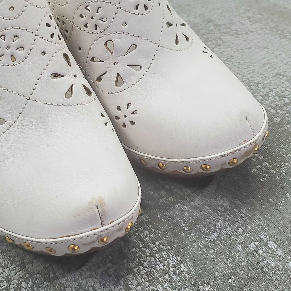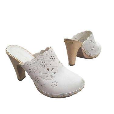 Leather Cutout Wooden Clogs, Interior leather shows permanent ink transfer; does not affect wear. β