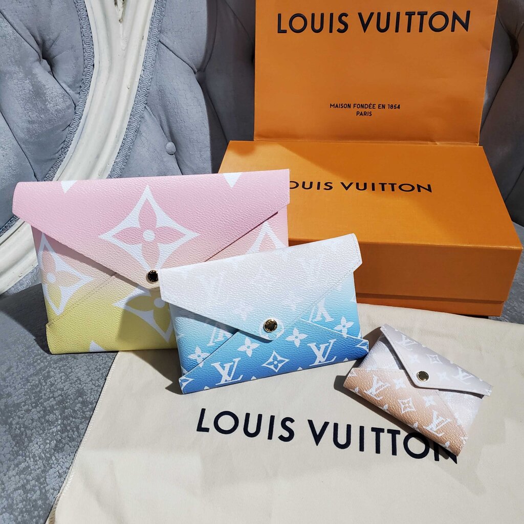Brand: Louis Vuitton Size: See listing for sizes Name: By The Pool Kirigami Pochette Color: Pink / Blue / Mist Gray Style: 3 Pochettes Material: Monogram coated canvas For Summer 2021, the Pochette Kirigami in Monogram canvas comes in a special edition as part of the By The Pool collection of leather goods, ready-to-wear and accessories Each of the three envelopes features one of the collection's color gradations The largest pouch holds a tablet, the medium one a passport, and the small one cards 6.1 x 4.5 x 0.2 inches (length x Height x Width) Large: L 23 x H 16.5 x W 0.3 cm/L 9 x H 6.5 x W 0.1 inches Medium: L 15.5 x H 11.5 x W 0.3 cm/L 6 x H 4.5 x W 0.1 inches Small: L 10 x H 7 x W 0.3 cm/L 3.9 x H 2.8 x W 0.1 inches Monogram coated canvas Cowhide-leather lining Gold-color hardware Press-stud closure Comes in original LV box with dustbag Great gift