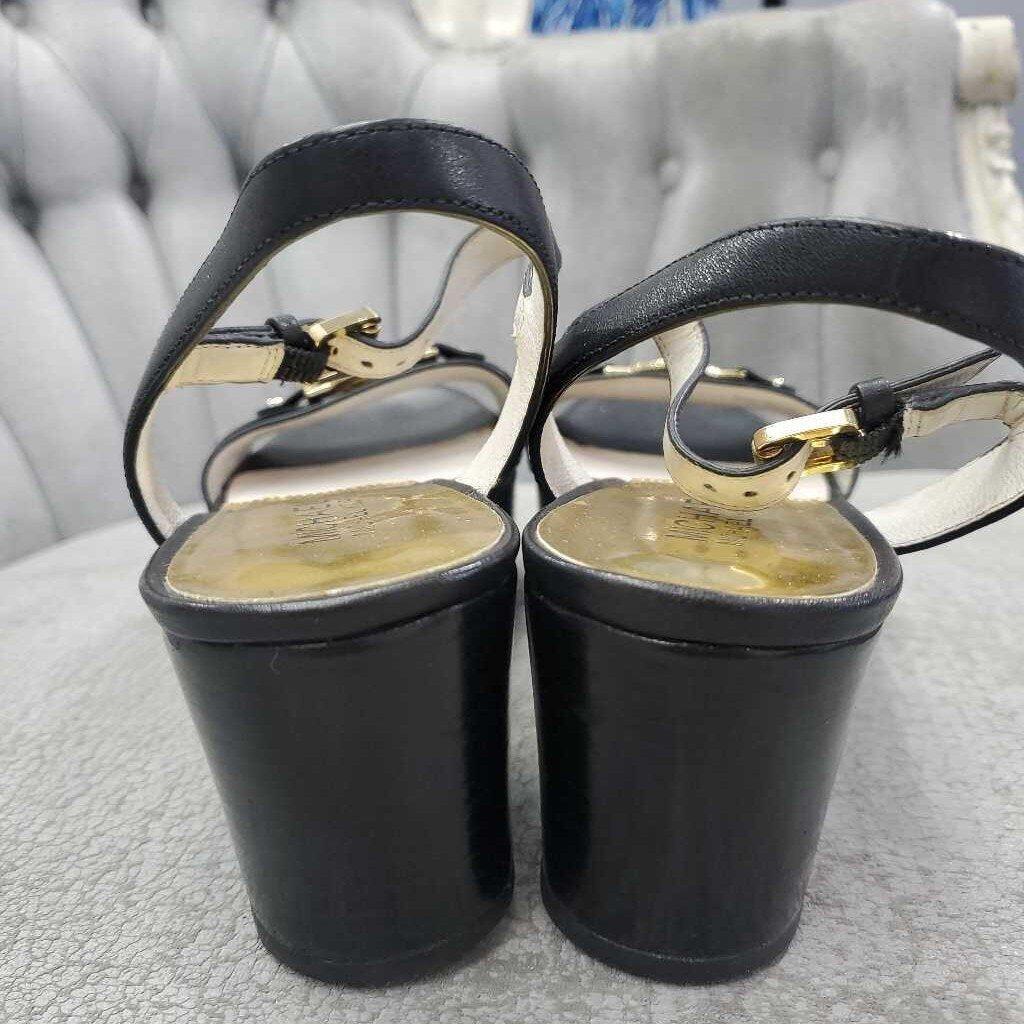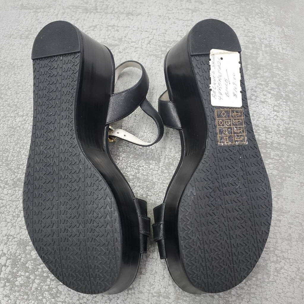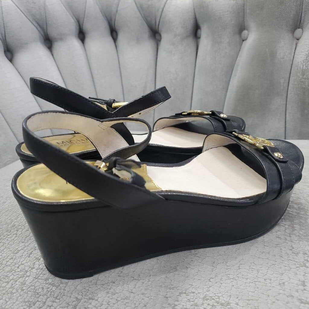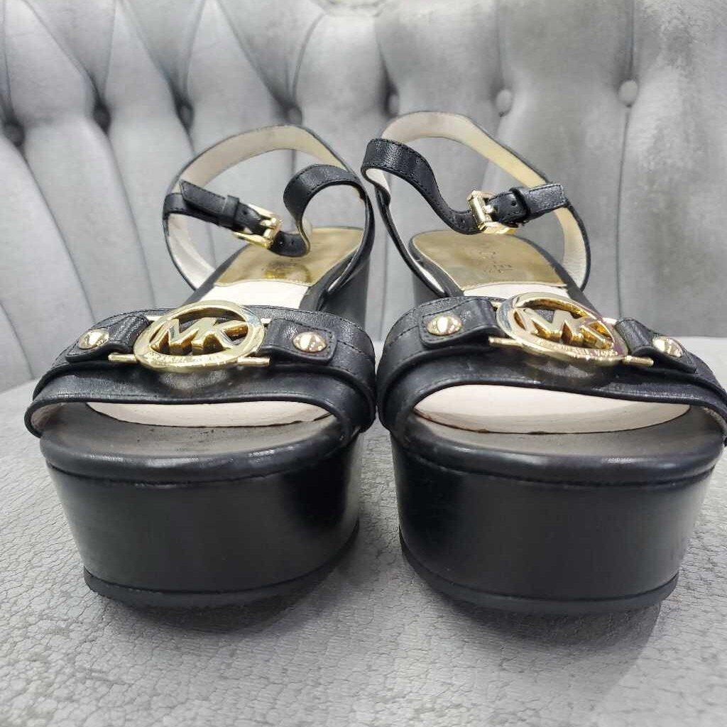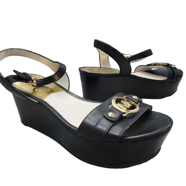 Michael Kors Black Leather Platform Wedge Sandals Size 6.5 Gold Logo MK β