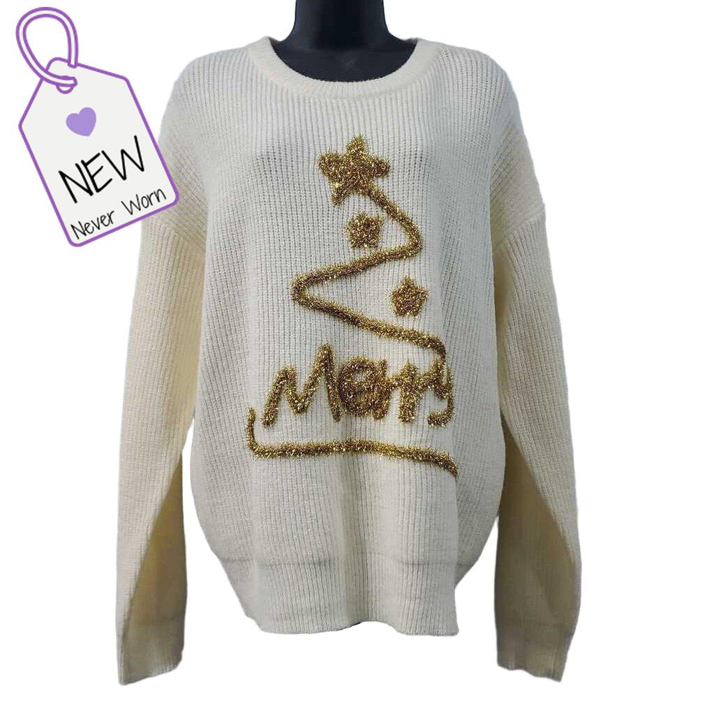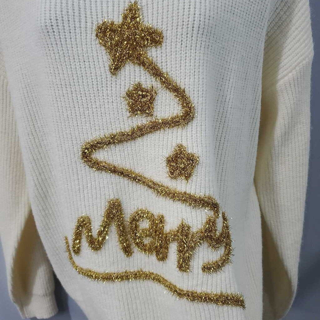 Long Sleeve Christmas Sweater NWT, Gold Tinsel Tree Design, Merry β