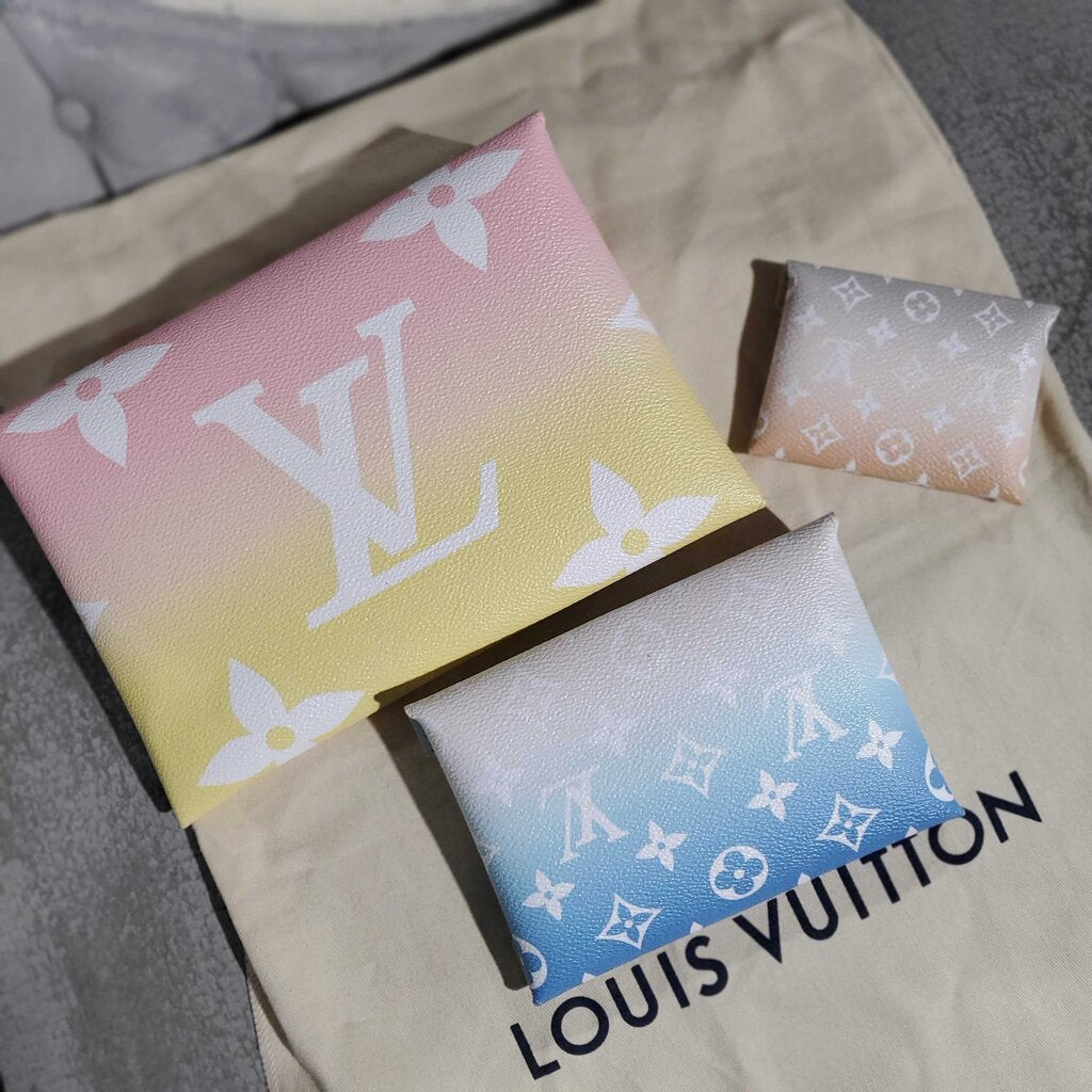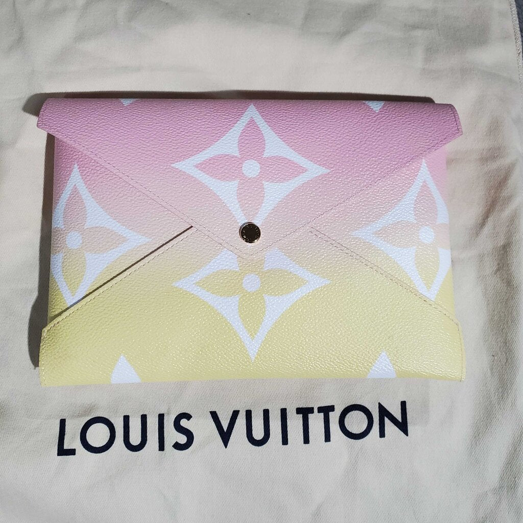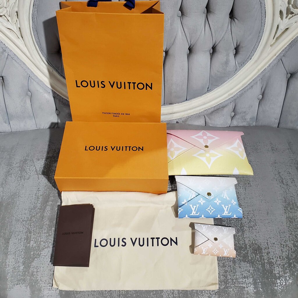 Brand: Louis Vuitton Size: See listing for sizes Name: By The Pool Kirigami Pochette Color: Pink / Blue / Mist Gray Style: 3 Pochettes Material: Monogram coated canvas For Summer 2021, the Pochette Kirigami in Monogram canvas comes in a special edition as part of the By The Pool collection of leather goods, ready-to-wear and accessories Each of the three envelopes features one of the collection's color gradations The largest pouch holds a tablet, the medium one a passport, and the small one cards 6.1 x 4.5 x 0.2 inches (length x Height x Width) Large: L 23 x H 16.5 x W 0.3 cm/L 9 x H 6.5 x W 0.1 inches Medium: L 15.5 x H 11.5 x W 0.3 cm/L 6 x H 4.5 x W 0.1 inches Small: L 10 x H 7 x W 0.3 cm/L 3.9 x H 2.8 x W 0.1 inches Monogram coated canvas Cowhide-leather lining Gold-color hardware Press-stud closure Comes in original LV box with dustbag Great gift