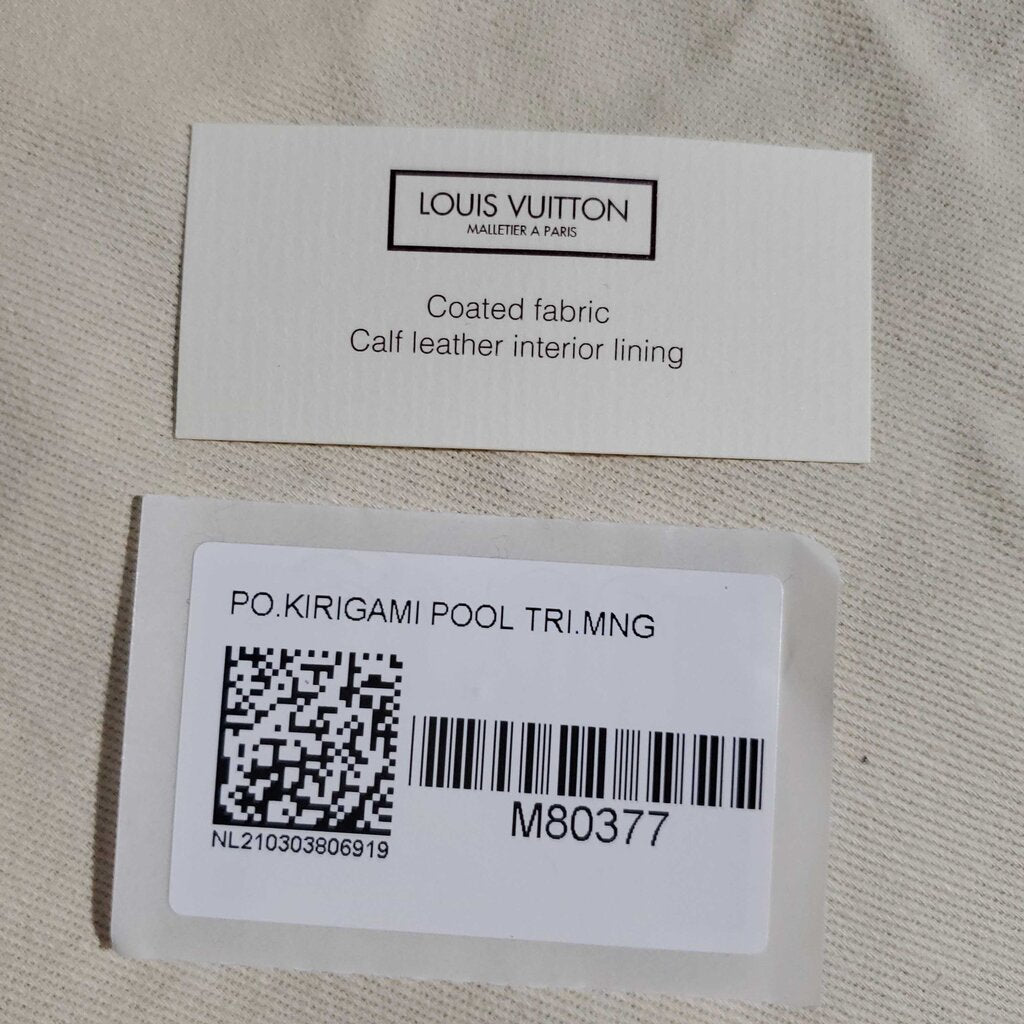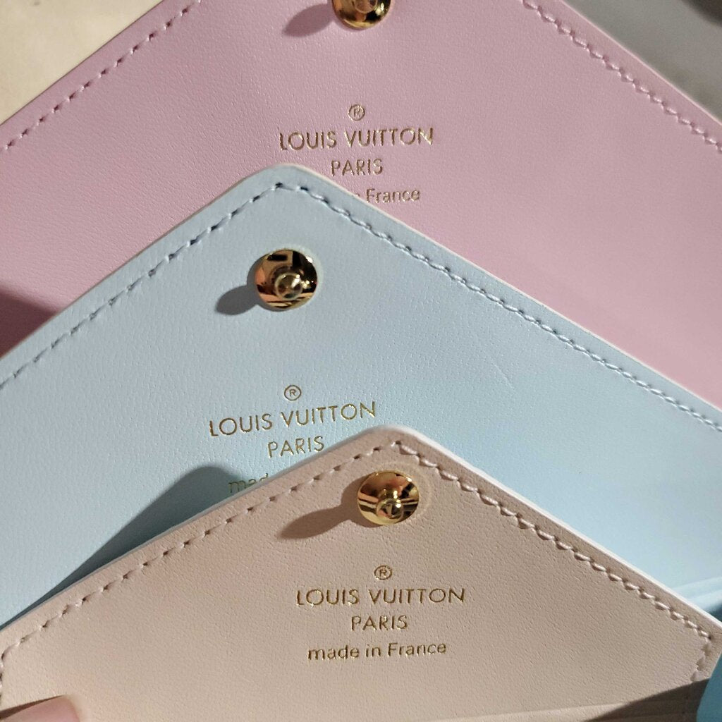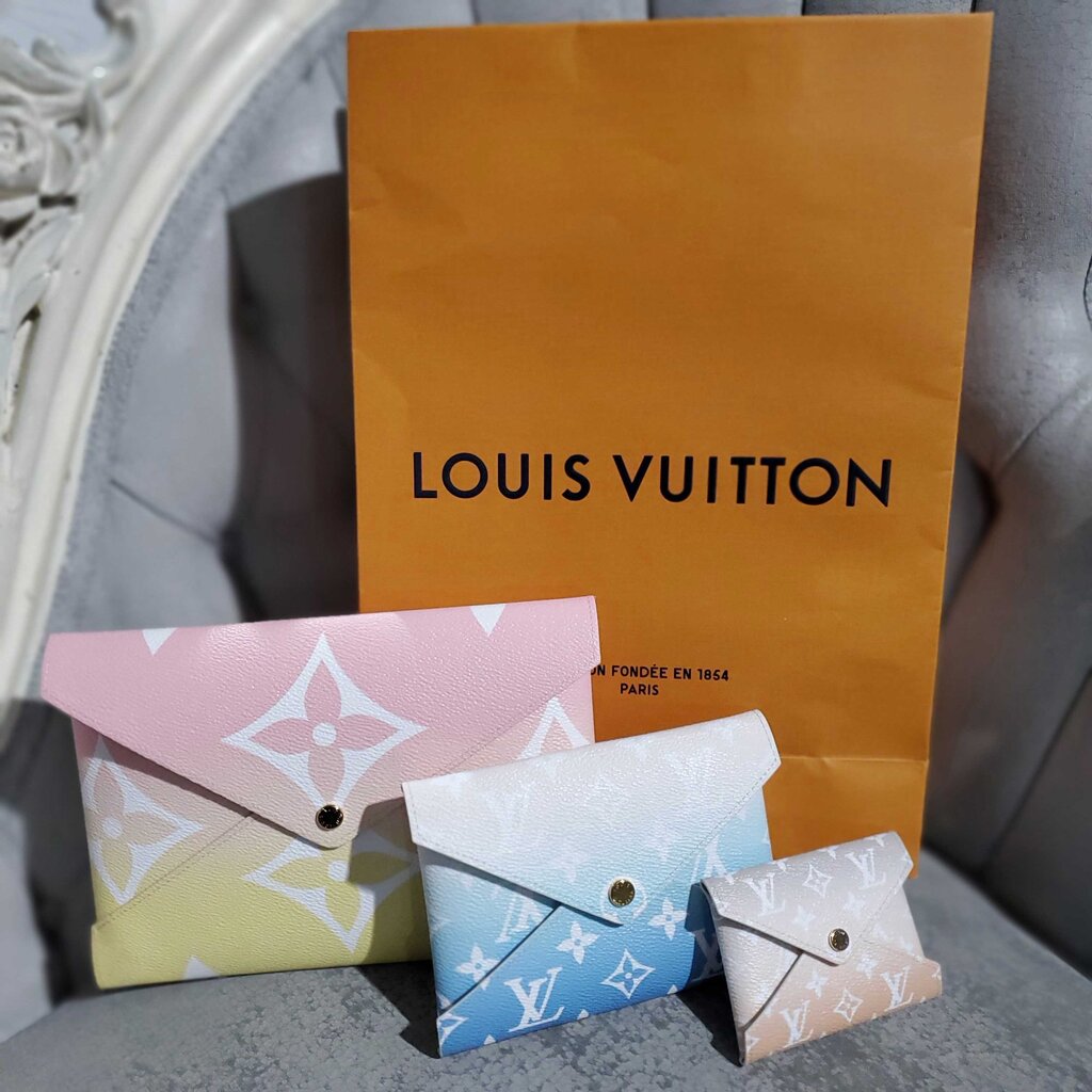 Brand: Louis Vuitton Size: See listing for sizes Name: By The Pool Kirigami Pochette Color: Pink / Blue / Mist Gray Style: 3 Pochettes Material: Monogram coated canvas For Summer 2021, the Pochette Kirigami in Monogram canvas comes in a special edition as part of the By The Pool collection of leather goods, ready-to-wear and accessories Each of the three envelopes features one of the collection's color gradations The largest pouch holds a tablet, the medium one a passport, and the small one cards 6.1 x 4.5 x 0.2 inches (length x Height x Width) Large: L 23 x H 16.5 x W 0.3 cm/L 9 x H 6.5 x W 0.1 inches Medium: L 15.5 x H 11.5 x W 0.3 cm/L 6 x H 4.5 x W 0.1 inches Small: L 10 x H 7 x W 0.3 cm/L 3.9 x H 2.8 x W 0.1 inches Monogram coated canvas Cowhide-leather lining Gold-color hardware Press-stud closure Comes in original LV box with dustbag Great gift