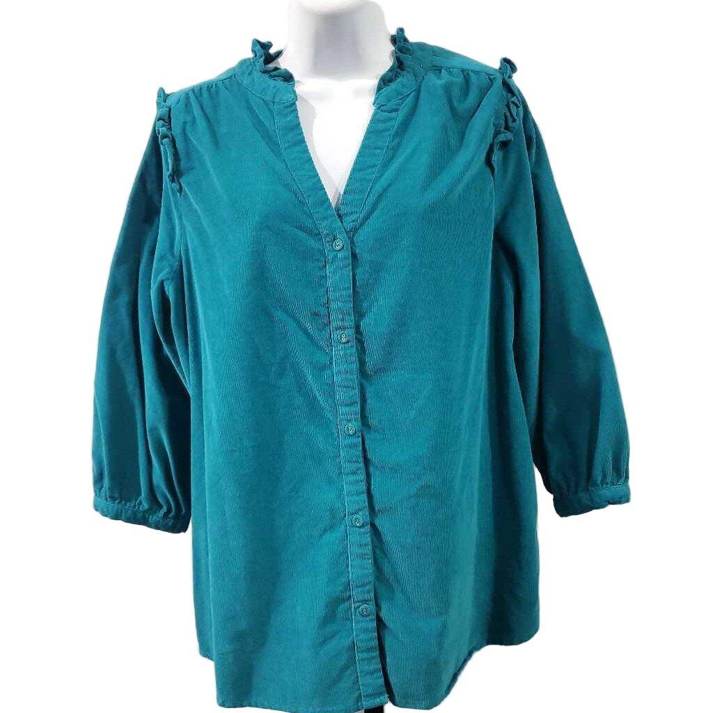 Long Sleeve Pinwhale Corduroy Button Up Top, Ruffle Accent â