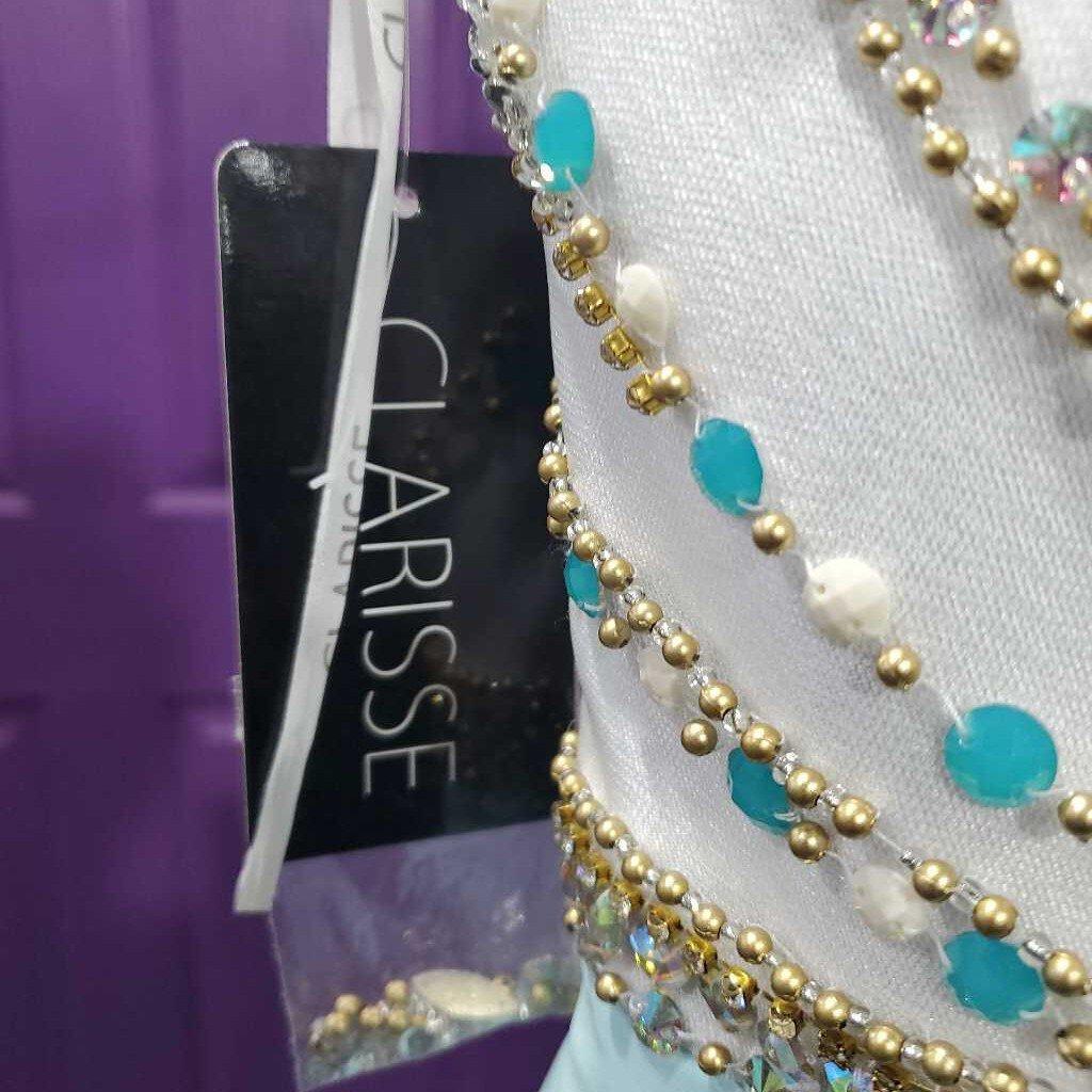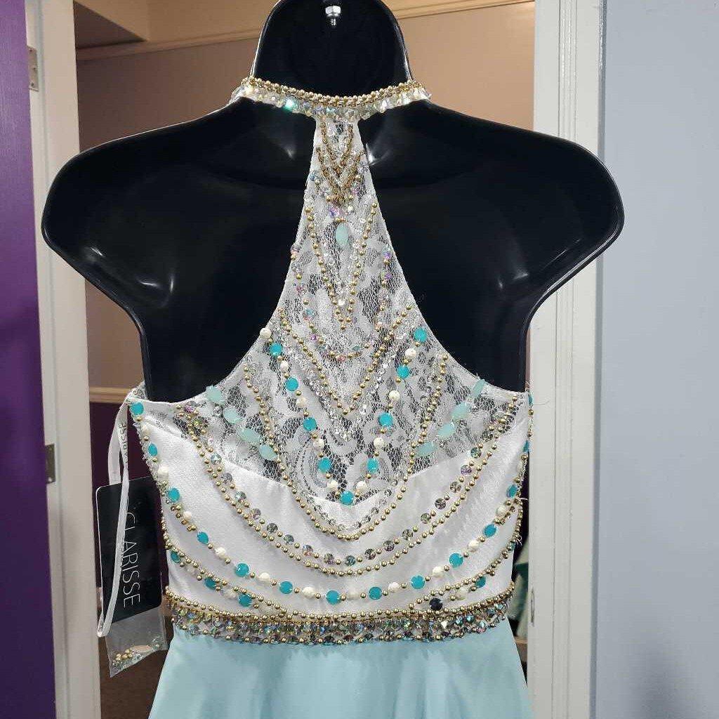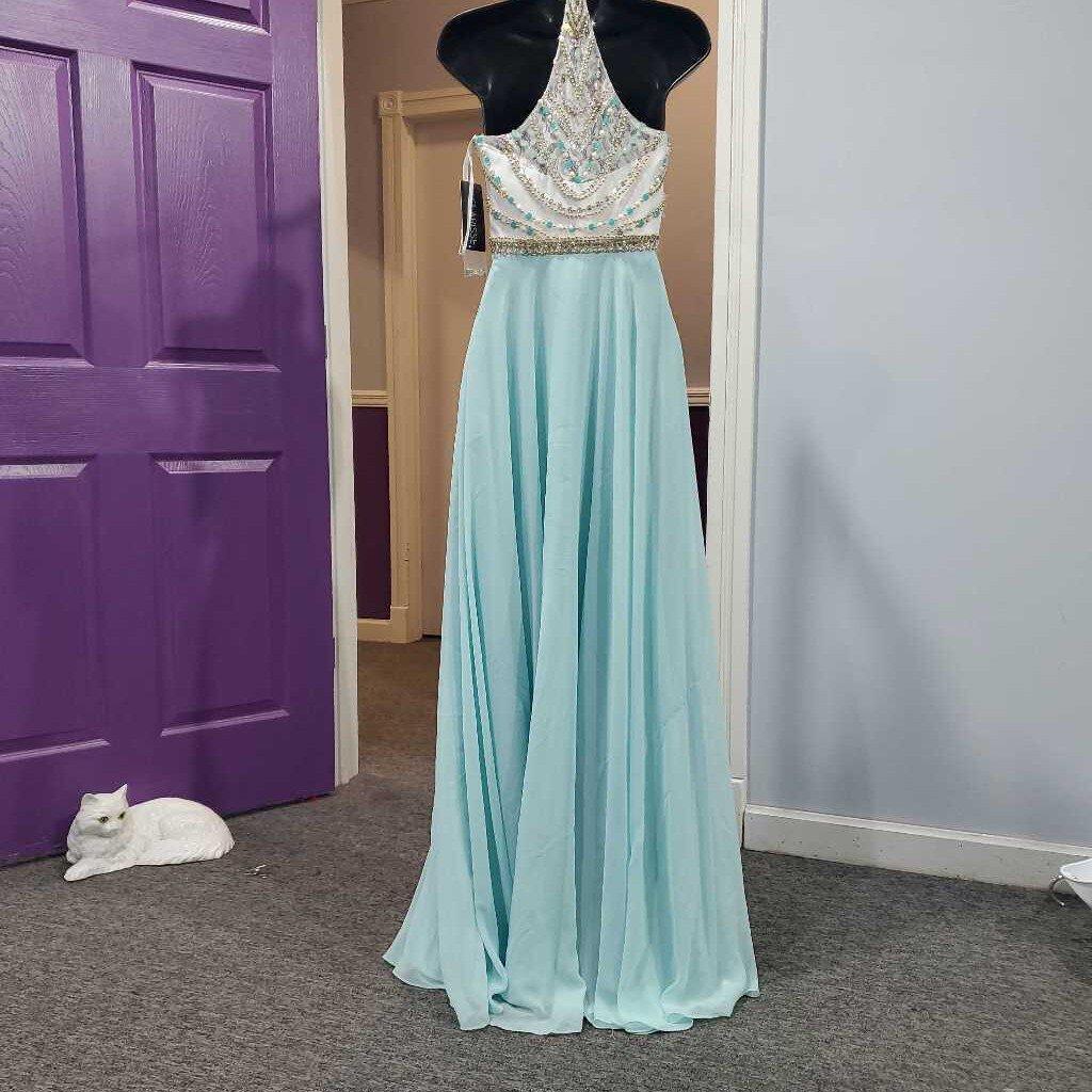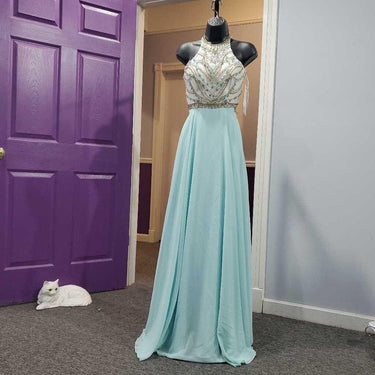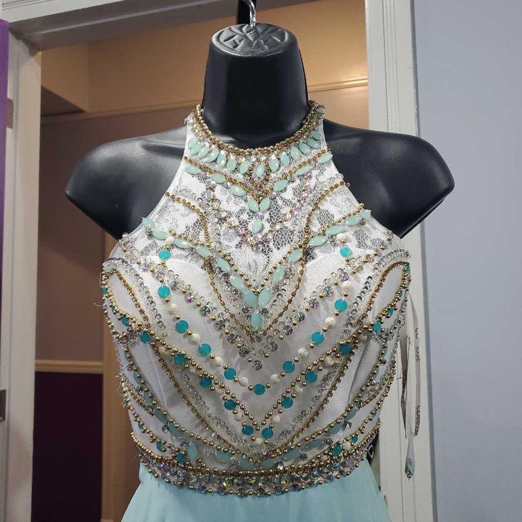 High Neck Beaded Bodice Formal 3069 1036 As Is - has small pin holes where pageant number was pinned â