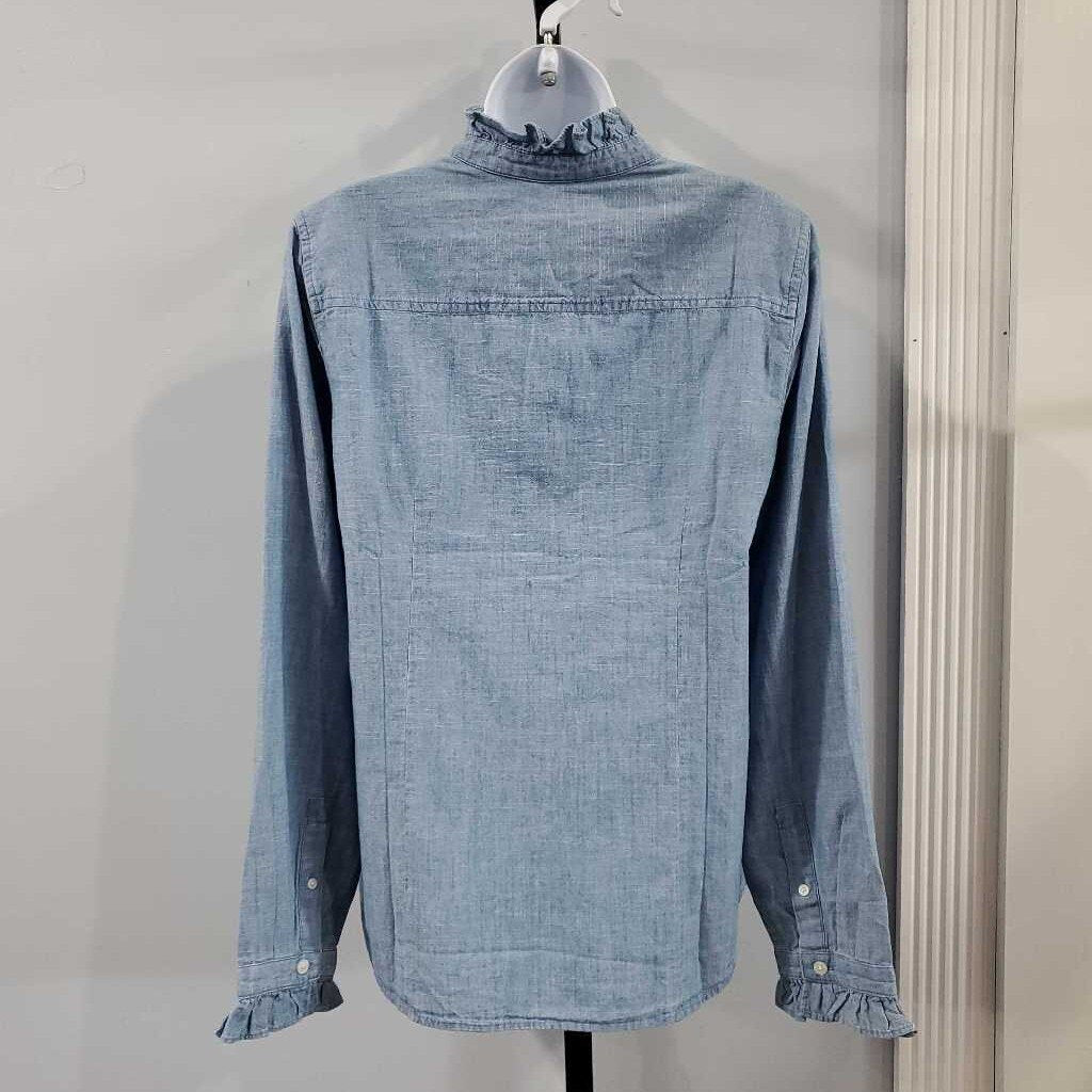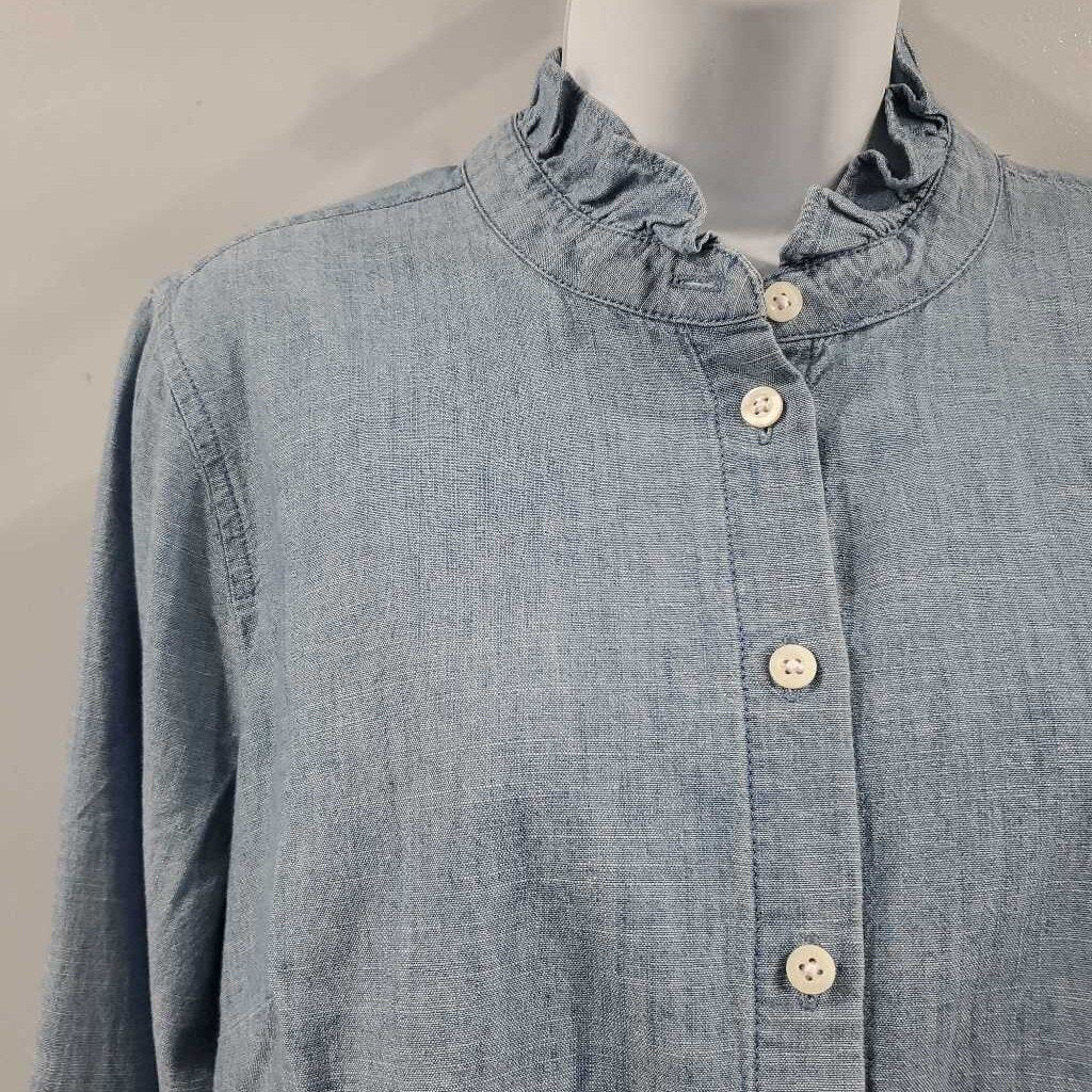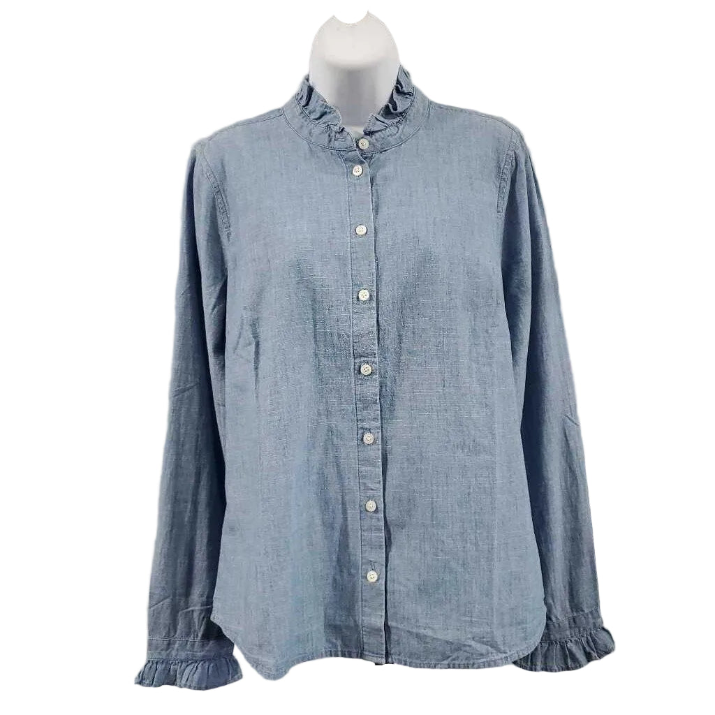 Long Sleeve Ruffle Accent Chambray Button Up Top
