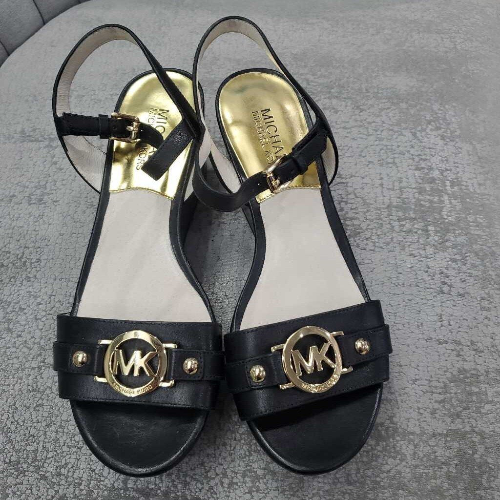 Michael Kors Black Leather Platform Wedge Sandals Size 6.5 Gold Logo MK β